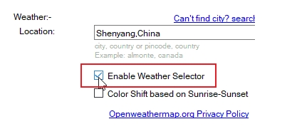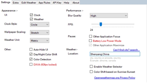 要让它显示实际天气,需要在设置中设置位置,需要英文格式的地名加国家,比如中国沈阳。位置等设置默认会自动隐藏桌面显示的时钟和天气,只有鼠标指向时才会显示,不需要自动隐藏的可以在这里取消。另外可以在这里设置昼夜桌面的亮度变化、虚化效果、失焦暂停等。