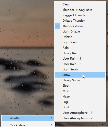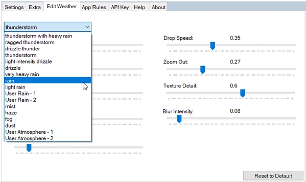 自定义天气桌面效果不受实际天气影响。在设置中的“编辑天气”选项卡下,您可以编辑大多数天气效果的强度和其他参数。