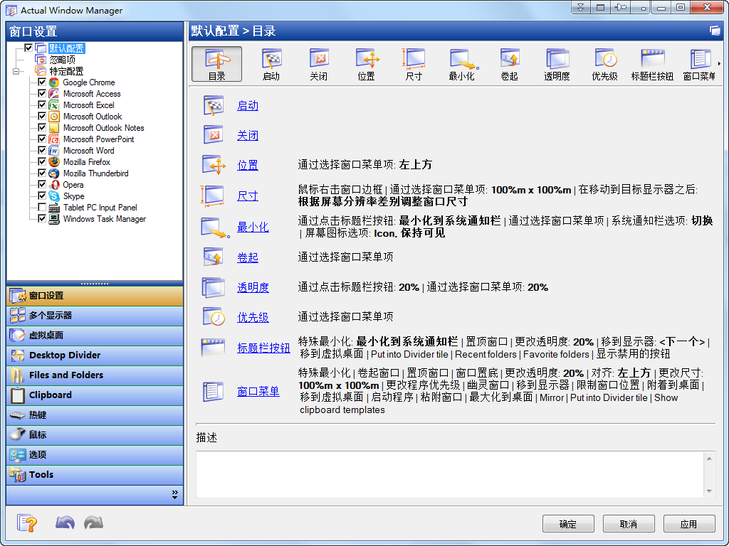 实际窗口标记可以管理任何窗口形式的一切!它对您的窗口进行了一些更改,包括在原始窗口标题列最大化和最小化按钮旁边添加了一些实用的按钮,这些按钮可以将任何所需的窗口保留在桌面的顶部,或者在窗口最小化时,如果任务栏已满,则在状态区域或桌面中将其最小化。此外,它还可以增加任何窗口的透明度,包括任何软件或任何窗口等。它的目的不是改变你使用窗户的习惯,而是最大化和增强它们。