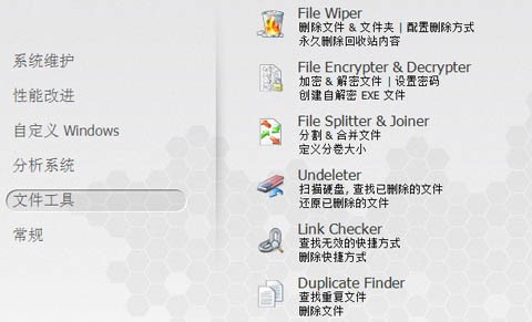 Ashampoo WinOptimizer最大的特色是它还集成了一些专业的文件工具,比如永久删除文件/文件夹、加密工具、拆分合并文件、恢复删除的文件、删除无效快捷方式和查找重复文件等。