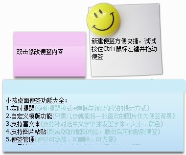 小孩桌面便签是一个可以自定义的桌面笔记应用小工具。小孩桌面便签最新版本可以用软件轻松记录待办事项。小孩桌面便签还有一个功能强大的笔记管理器,可以为你的笔记管理器设置密码,也可以当笔记本使用。
