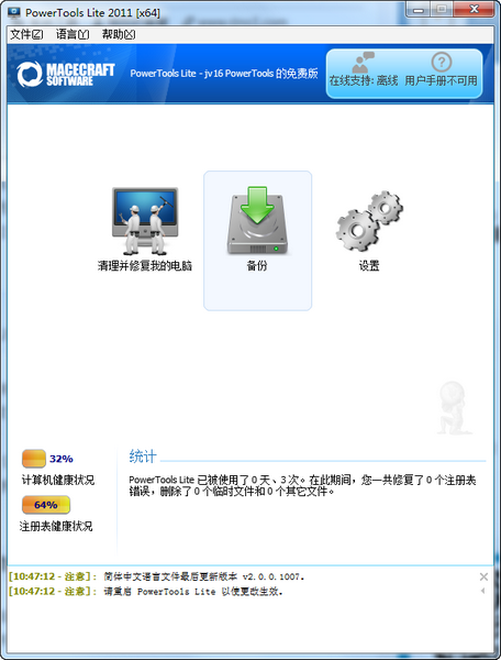 PowerTools Lite是国外的系统优化软件,可以清理注册表和系统垃圾。其特点是可以选择优化强度,从而防止过度优化。备份也是它的特色功能。你可以用它一键备份收藏夹、开始菜单、桌面、我的文档等等。