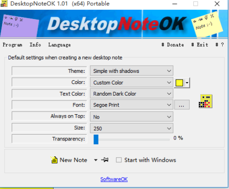 DesktopNoteOK是一款免费实用的桌面笔记小工具,可以帮助用户在桌面上快速创建笔记。它有漂亮的休闲选项和各种自定义选项,包括字体、颜色、字体大小、透明度等。它绿色环保,无需安装,小巧方便。
