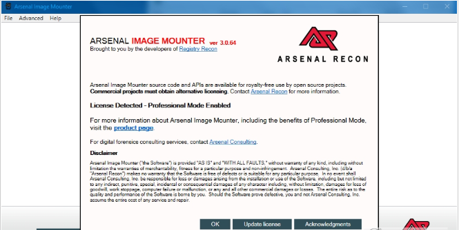 Arsenal Image Mounter是一个虚拟SCSI适配器,它允许用户通过独特的Storport miniport驱动程序从Windows中特定于磁盘的功能中受益,例如与磁盘管理器集成、访问卷影副本等。该软件可以在您的计算机上安装具有最完整磁盘映像的磁盘。Arsenal Image Mounter P专业版不会共享或分区,也不支持常用的磁盘镜像格式,使用起来非常方便。Arsenal Image Mounter最新版本功能强大,提供强大的虚拟SCSI适配功能。/[k0/]软件方便易用。它支持独特的Storport微型端口驱动程序,允许用户受益于Windows中特定于磁盘的功能,例如与磁盘管理器集成、访问卷影副本等。