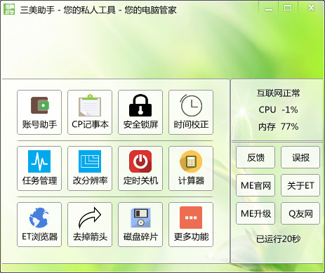 三美助手是一个强大的系统增强工具。该软件具有资源消耗低、简单、可移植的特点。它内置了电脑自带的常用软件,如记事本、安全锁屏、任务管理、定时关机、计算器、磁盘碎片等。,用户可以更方便地调用。同时,三美助手增加了一个助手,可以用更安全的加密方式保护大家;此外,软件还对常用软件进行了优化,无需任何内存即可运行,非常实用。功能强大,包括助手、CP记事本、安全锁屏、时间修正、任务管理、分辨率更改、预定关机、计算器、磁盘碎片、移除快船等。,可以让用户更安全,而且所有功能都可以快速打开,大大提高了工作效率。