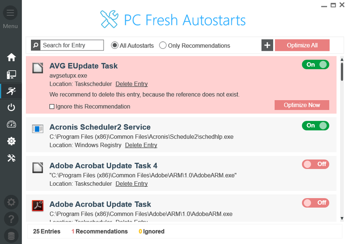 很多没有启动的程序都是从Windows启动的。其中许多是不需要的。PC Fresh中的一个特殊模块列出了所有启动应用程序,并允许您禁用所有不符合您需求的应用程序。