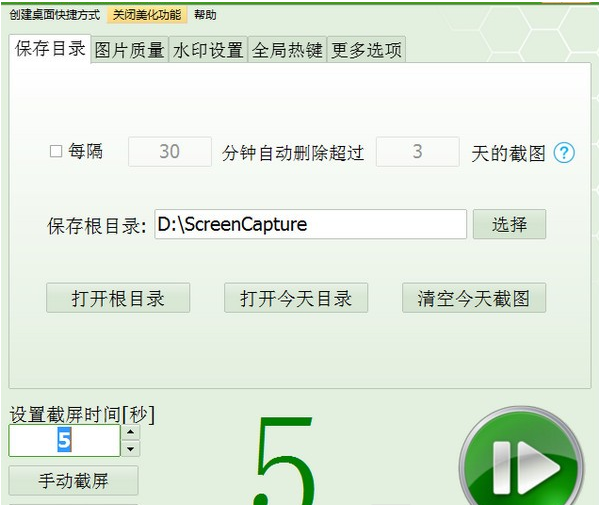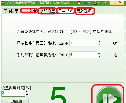 分别是画质设置、水印设置、全局热键设置和更多选项设置。单击开始。