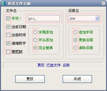 4)“追加字符”是指在后缀名称后添加输入的字符;“替换后缀”是用选中的后缀名称替换原文件的后缀名称;“清除后缀”是删除源文件的后缀名称。