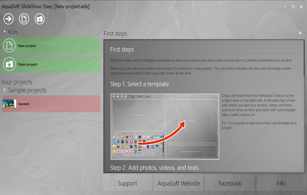 AquaSoft SlideShow Easy是一款专业的幻灯片电子相册制作工具,可以快速将你的照片制作成专业的电子相册。虽然AquaSoft SlideShow Easy是一个幻灯片演示工具,但它有多种内置字体样式、多轨道时间轴、生动的显示模式和各种图像的融合模式等。,它可以完全产生由专业编辑制作的效果,并将您的静态照片图像转化为华丽的动画演示。它是家庭安装的必备工具。