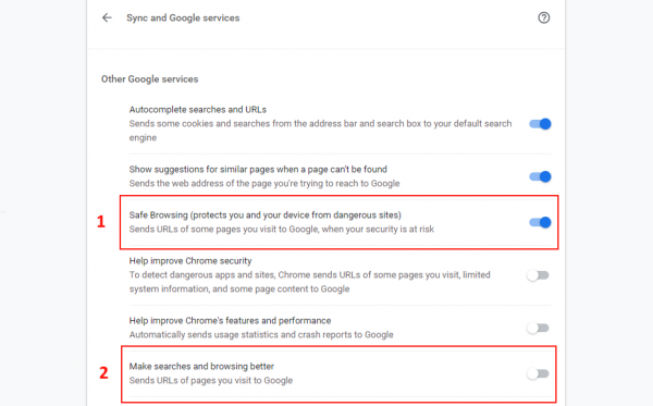 随着Chme 79的发布,谷歌表示,Chme将在“同步和谷歌服务”部分提供新的选项,让用户可以实时扫描不良网站。下图中的选项1表示安全浏览已启用。选项2授予Chme浏览器发送L到安全浏览的权利。打开这两个选项以启用实时安全浏览。