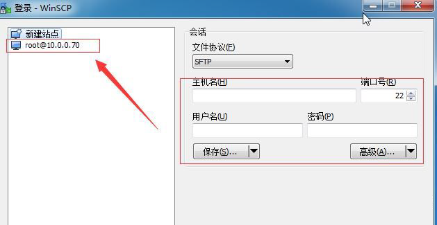 1.在打开的页面上填写远程主机的IP、用户名和密码,点击保存,页面左侧会出现一个站点。下一次,可以直接双击站点登录远程主机,如图: