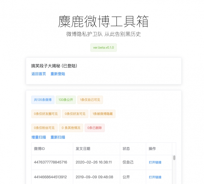 麋鹿微博工具箱是专业的微博管理软件,允许用户批量删除或隐藏自己的微博内容,让你的隐私可以自己显示或隐藏。