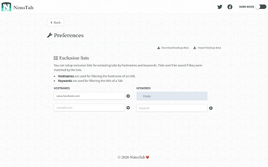 此外,您可以设置一个排除列表,通过主机名和关键字排除选项卡。如果标签与列表匹配,它将不会被保存。可以使用NimoTab清理凌乱的标签栏,优雅地保存标签。