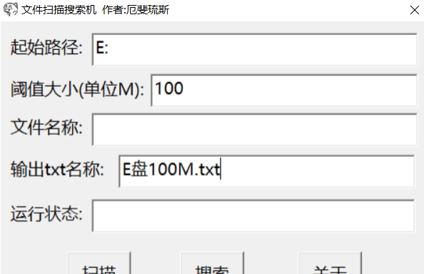 有两个功能,一个是扫描,即扫描指定路径中超过指定阈值大小的文件,另一个是搜索,与电脑自带的搜索功能相同,但会更快。核心程序用python编写,界面用VC6.0的MFC做,做的早,做的丑。扫描和搜索的结果将被写入指定的txt文件。