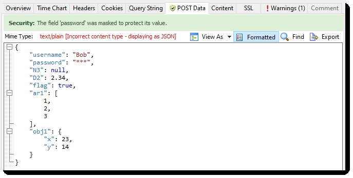 HttpWatch现在可以对ON内容进行格式化并应用密码屏蔽,即使内容类型被错误地格式化为另一种格式: