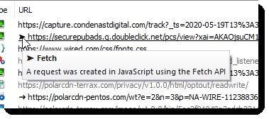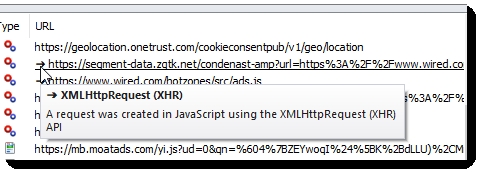 在Chme和Edge中,l旁边的箭头符号表示该请求是使用Javascpt中的XmlHttpRequest(XHR)应用编程接口创建的: