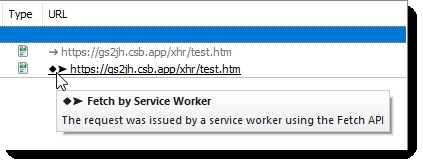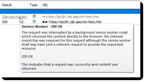 当服务工作者脚本截获请求时,现在将显示结果(服务工作者)。状态代码位于数据提示或概述选项卡中: