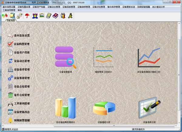 8.设备点检维护管理:主要包括:设备劣化倾向录入、温度劣化倾向分析、振动劣化倾向分析、设备年检录入、设备点检标准、设备点检计划、设备周期计划、设备维护技术标准、设备维护作业标准、设备维护计划、设备维护记录、近期需要维护的设备明细、设备维护派工单、设备维护合同。相关表格可以打印出来。