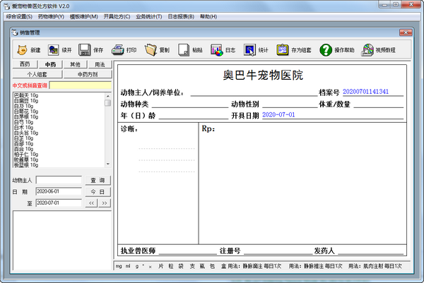 本软件的处方格式采用标准兽医处方格式,处方打印纸尺寸为A5纸(A4纸的一半大小,文具店可以买到)。