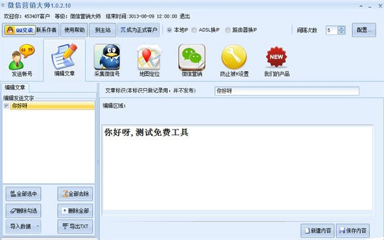 微信营销是一款高效的微信推广软件,可以用单机模拟真实的微信营销环境,安全稳定,快捷方便。为了防止被K攻击,可以做多周期营销,使用ADSL模式,路由器切换到IP,简单。