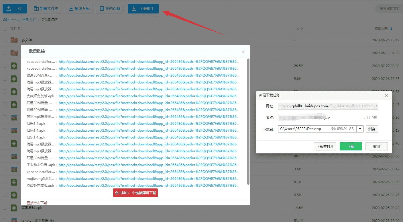 在百度网盘中选择文件,点击助手按钮,选择合适的方法直接下载文件。