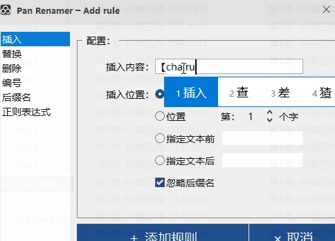 可以插在文件名的头/尾,指定字符的前/后,忽略扩展名或不忽略扩展名。