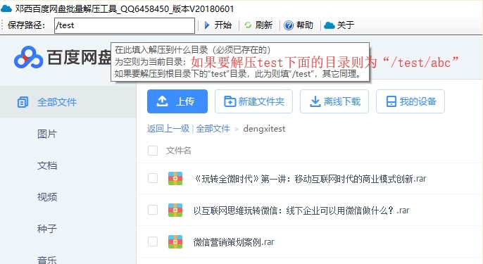 在工具左上角的“保存路径”中输入要将文件解压到的目的目录的路径(如果解压到当前目录,则不需要输入,留空即可)。如果要将压缩文件解压到另一个目录,比如根目录中的“test”,填写“/test”,其他路径相同。