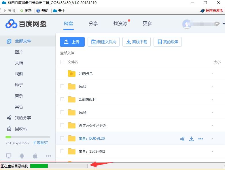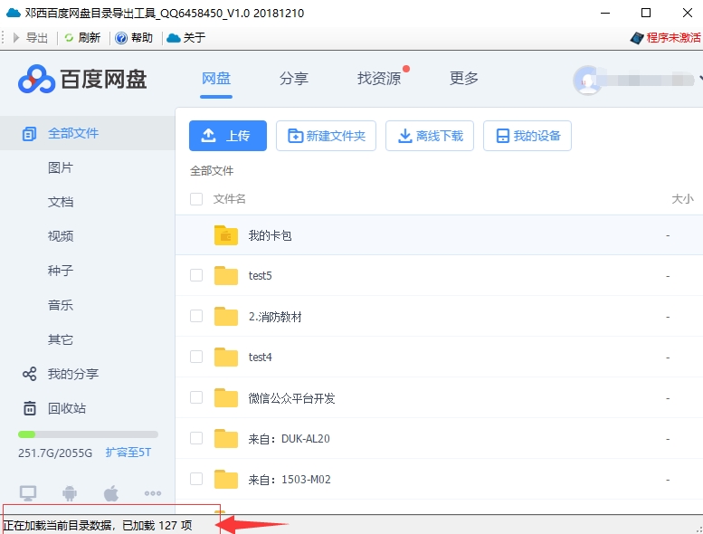 以导出“我的网盘”为例。点击左上角的“导出”按钮,程序自动加载网盘数据,左下角提示进度。
