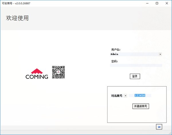 1.设置登录商品名称(显示在上面的红框中)。如果您已经开通可名商号,请输入商品名称(数字标识)。如果您想评估试用,请输入(或保留)默认的试用商品名称:123456。如果你想开一个新的商号,请点击:开一个新的商号2。设置登录用户名和密码。输入用户名和密码。初始默认设置是:用户名:管理员密码。无密码>如果不想每次登录都输入用户名和密码,可以勾选“记住登录”和“记住密码”。出于安全考虑,请不要在多人使用的公共电脑上使用该功能。确保用户名和密码填写正确,然后单击登录按钮。3.权限和安全性如果您成功登录,您将被引导至下图所示的界面: