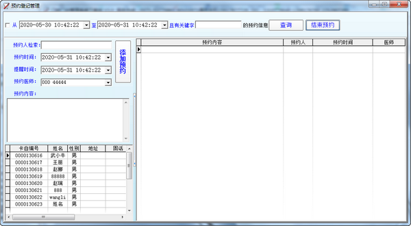 4.预约管理:预约登记的患者,到期时会自动提醒,并在主窗口列出;此外,我们还有预约提醒、预约延迟、患者流失等。,让您的门诊预约井然有序。