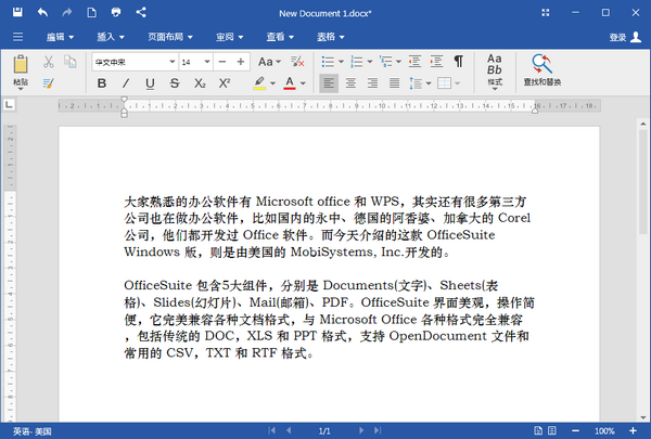 大家对Micsoft office、WPS等办公软件都很熟悉。其实很多第三方公司也在做办公软件,比如中国的永中,德国的Granny,加拿大的Corel公司,都开发了办公软件。今天介绍的windows版office套件是由Mobis,Inc .开发的,office套件由五个组件组成,分别是文档、工作表、幻灯片、邮件和PDF。OfficeSuite界面美观,操作简单。完美兼容各种文档格式,完全兼容Micsoft Office的各种格式,包括传统的DOC、XLS、PPT格式,支持OpenDocument文件和常用的CSV、TXT、RTF格式。