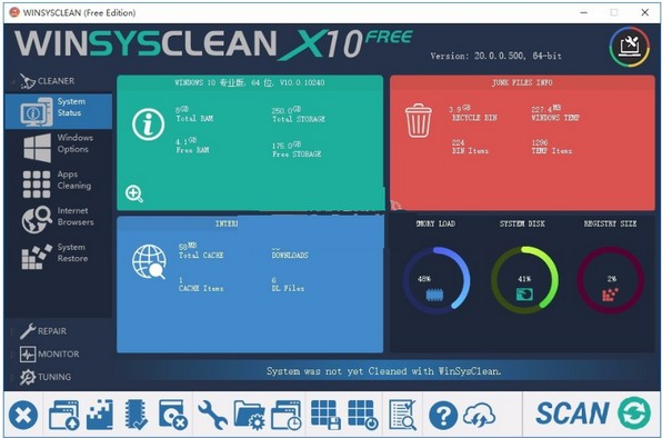 WinSysClean X10 Free一款注册表清理修复工具,这款软真的是在业界内出了名的好用,它一键扫描、清理、修复、优化您的电脑,最主要的是这款软件非常安全。没有其他的注册表清理工具比 WinSysClean 更容易使用或更有效。WinSysClean 是一个完全自动化的 Windows 系统清理工具。可用来清除系统无用或隐私资料,包括:IE和Netscape浏览器的快取(Cache)、历史记录(History)、Cookies、暂存目录的文件、资源回收站、历史记录、文件历史记录、无用的登录文件、无效的捷径连结、Internet下载文件目录、视窗登录备份文件等等,全部可清除的功能皆以设定好,只需在要删除的项目中打勾或取消,只需一个动作即可完成清除,除可手动清除外也可设定自动清除,可以让你的硬盘多些空间,系统执行更顺畅。