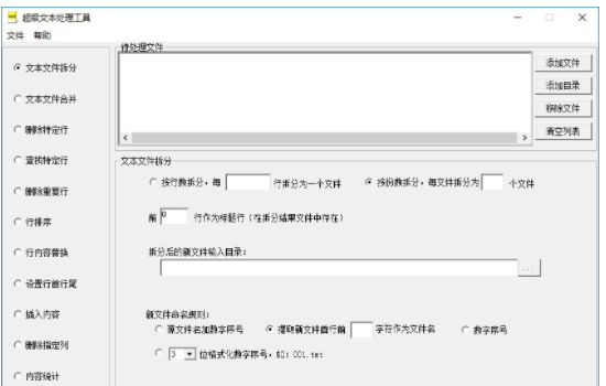 超级文本处理工具是一款强大的文本文件批量处理工具,可以对文本文件进行拆分和合并,根据具体条件批量删除或搜索文本中的特定行。