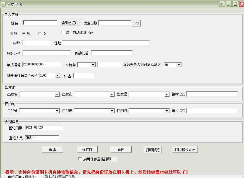 道路交通卡口防疫人员登记该软件主要用于道路卡口防疫人员对来往人员进行身份登记管理,利用刷身份证功能,自动采集身份证内信息,快速登记人员。