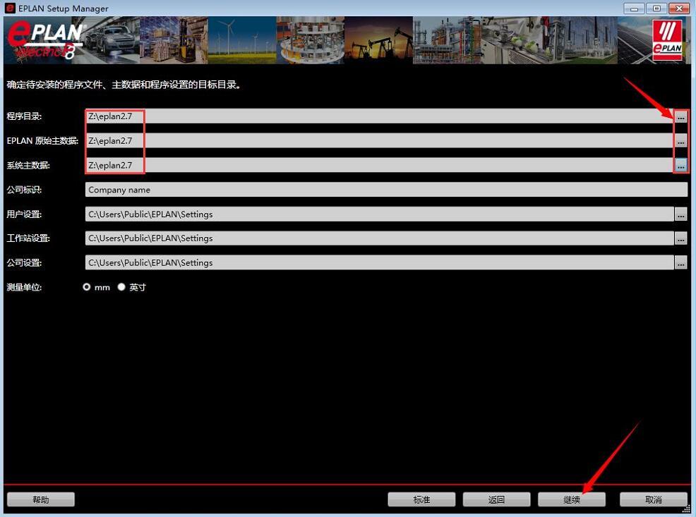 5.分别点击程序目录、EPLAN原、系统主数据三项后面的…可以改变安装路径,建议安装在除c盘以外的其他磁盘上,可以在D盘或其他盘上创建eplan2.7文件夹。单击继续。