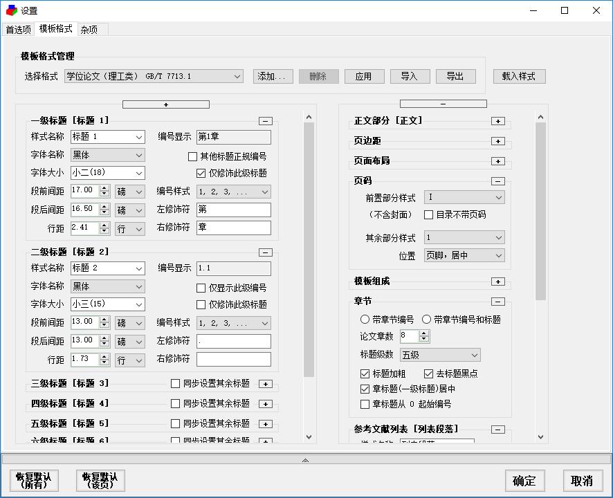 论文格式快速编排助手提供了模板格式的管理功能(增加、删除、应用),可以一键创建自动标题编号的论文模板。论文模板的参考标准有:GB/T 7713.1学术论文写作规则、GB/T 7713.2学术论文写作规则和GB/T 7713.3科技报告写作规则。