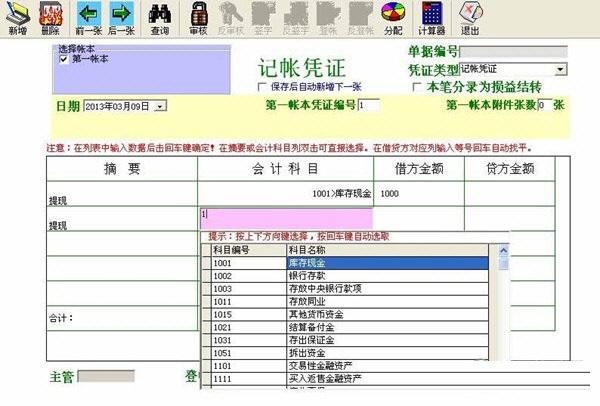 6.可以通过树形目录直接选择账户;也可以通过账户代码快速录入;