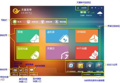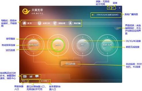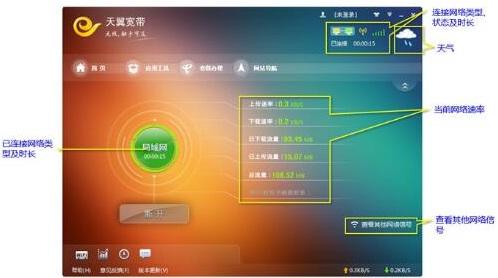 1.天翼宽带客户端覆盖电信所有网络接入(天翼宽带WiFi、天翼宽带3G、天翼宽带1X、有线宽带ADSL);