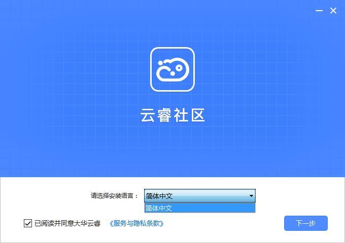 3.双击打开进入云睿社区软件界面。请仔细阅读以下安装许可协议,是否接受上述许可协议的所有条款,点击我同意,然后点击下一步。