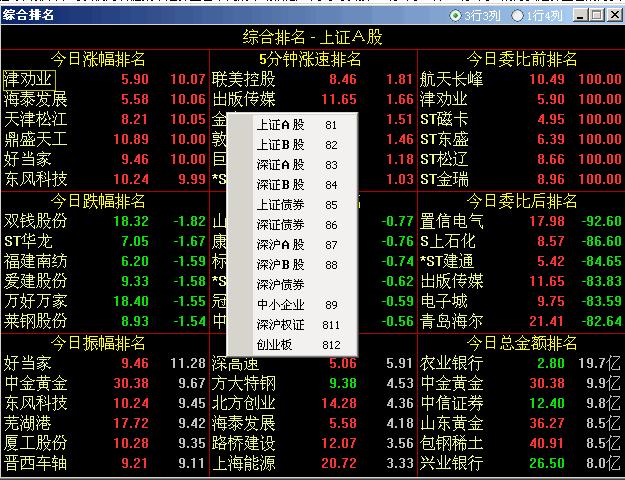 按数字81、82、83、84、85、86、87分别调出上海A、b股、深圳A、b股、上海债券、深圳债券、深圳a股的综合排名。系统以9个排列成正方形阵列的小窗口,列出所选市场中股票的涨幅、跌幅、振幅、5分钟涨幅、5分钟跌幅、比率、佣金比率和成交额。