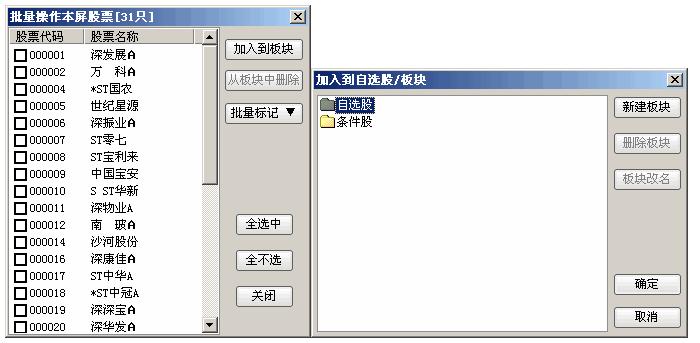 如果需要将某个板块或行业加入选股,可以使用批量操作: