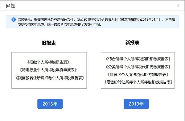 4.现在点击进入后,可能会出现一个窗口,其中【2018】是旧的申报表模型,适用于属于2018年12月及之前月份的申报表;【2019】是一种新模式的报关单,适用于期限为2019年1月及以后的报关单。