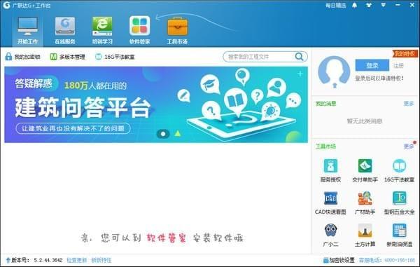 广联达G+工作台有很多功能:软件升级、价格下载、软件自动更新、培训报名提示等。它是一个综合性的软件。