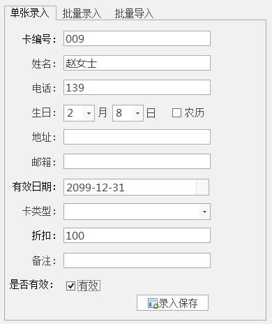 输入会员后,点击“输入并保存”完成会员卡输入。注:卡号为必填项,其他项目可根据需要填写;