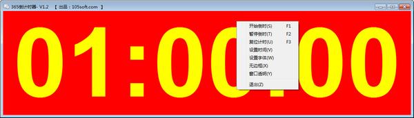 365倒计时器是一款免费简单的倒计时软件,可用于一般演讲比赛、篮球运动比赛、知识竞赛、教学计时等需要倒计时的场合。可以自由设置倒计时时间;可以设置倒计时文字的大小、颜色、字体;可选有无边框窗口、透明窗口背景(不遮挡PPT内容)等。;窗口位置可自由移动,窗口大小可自由推拉调整;定时有两个提醒(带声音或颜色变化),提醒时间可以设置。