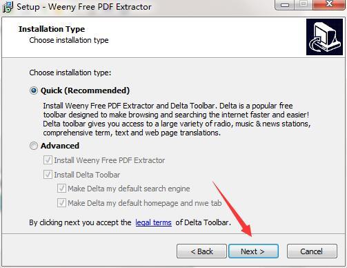 2.选择免费PDF提取器的安装类型,默认为快速安装或自定义安装。