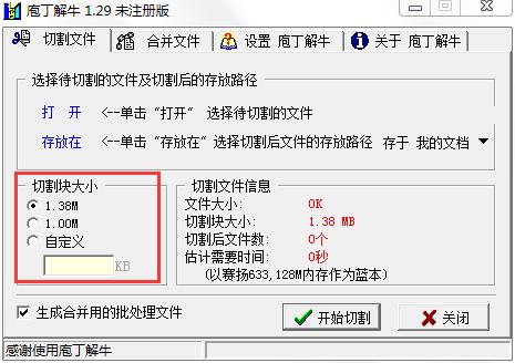 2.设置分区块的大小。有三个选项:1.38M,也就是软盘的大小,第二个是1.00M另外可以以k为单位自定义大小,在软件的右侧,列出了要切割的文件大小,切割块的大小,切割后生成的几个文件,大概需要的时间。