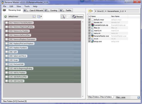 版本Rename Master支持重命名文件名、MP3歌曲标签和JPEG/JFIF/EXIF图片文件标签,轻松添加、删除和替换部分文件名。。