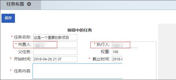 填写任务名称、安排人、执行人、开始时间、截止时间、任务内容六个必选项。安排人的违约是他自己,执行人的违约是他自己。可以点击文本框,弹出选人框,想选谁就选谁。