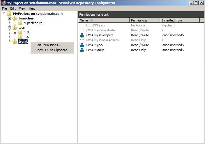 VisualSVN Repository Configurator(VisualSVN库配置器)是一个新的应用程序,不需要安装和执行管理权限。此外,库配置可以通过active directory自动部署组策略。